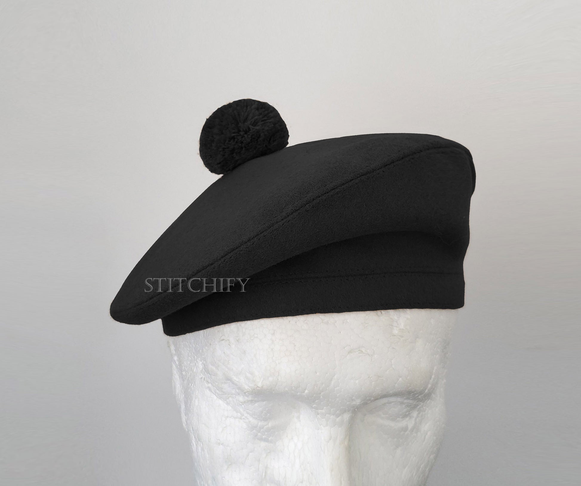 This black tam is expertly crafted for both men and women. Featuring a single-panel crown with precise double stitching and a subtle lower band, it seamlessly blends traditional charm with modern elegance. The soft pom (toorie) at the top adds a classic finishing touch, completing a timeless yet contemporary look.